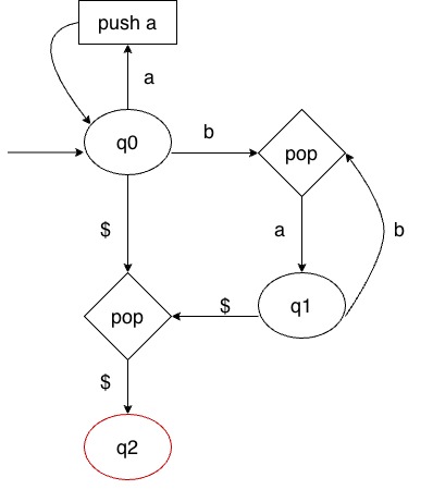 alphabet a b states q0 q1 q2 start q0 final q2 trans q0:a:q0:push:a trans q0:b:q1:pop:a trans q0:$:q2:pop:$ trans q1:b:q1:pop:a trans q1:$:q2:pop:$We can picture the DPDA as follows: